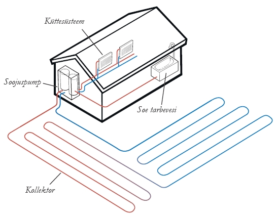 Tutvustan siinkohal Savonlinnas 2011. aasta sügisel kasutusele võetud maasoojuse rakendust. Tegemist on ühistu Asunto Oy Rantapajuga ja kinnistu koosneb kahest kolmekorruselisest kokku 25 korteriga korrusmajast. Kaugküte sinna ei ulatu ja kütteõli kallinemine on kõigile teadaolev tõsiasi, antud juhul moodustasid küttekulud juba 50% kõigist elamiskuludest. Hange läks maksma 100 000 eurot ja eesmärk oli saada aastas säästu 15 000– 20 000 eurot. Puuraugud tehti 15 meetri pikkuste vahedega Soomes laialdaselt esinevasse kaljupinnasesse, mis algas 15 meetri sügavusest ja mitte lähemal naaberkrundi piirist kui viis meetrit (lubatud on neli meetrit). Torustikus keerlev jäätu- matu vedelik soojeneb paari kraadi võrra ja aurustab soojuspumbas pöörleva külmaaine. Kompressoriga tõstetakse selle aurustunud külmaaine rõhku ja tulemusena selle temperatuur tõuseb. Soojuspumba jahutis muutub külmaaine taas vedelikuks ja loovutab oma soojuse sooja- jaotusvõrku soojendades seal ringlevat vett.
